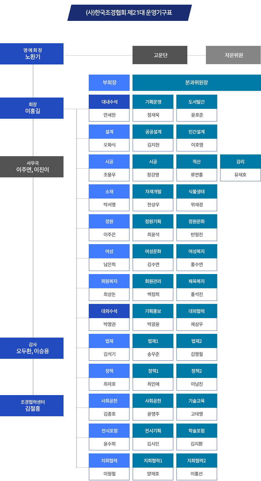 | 오충현(동국대학교 바이오환경과학과), 전승훈(가천대학교 조경학과), 이승용((주)다인산업개발), 안계동((주)동심원 조경기술사사무소), 설승진((주)건림원), 정진용(제일종합조경(주)), 조광형((주)푸른공간), 정영한((주)정한조경), 김용각((주)다원녹화건설), 김경섭(삼성물산(주) 리조트부문 조경사업팀) |